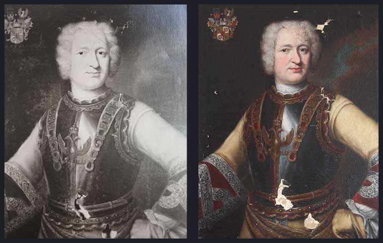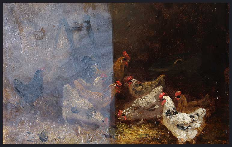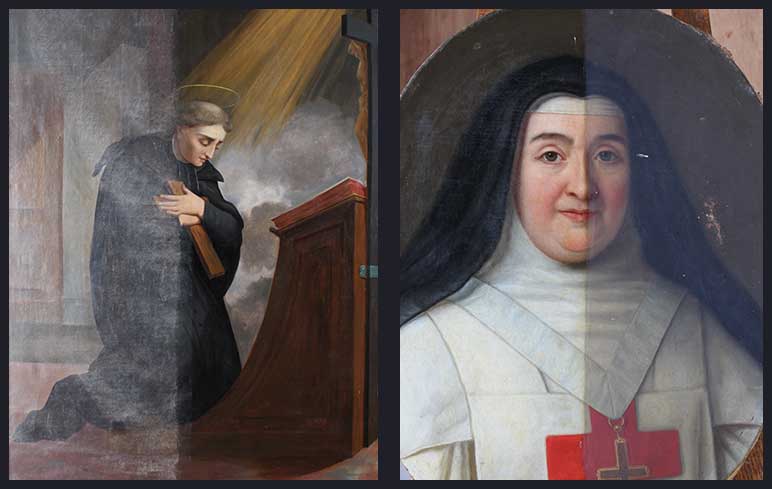La présence de repeints sur un tableau indique qu’il y a eu une restauration antérieure et donc des accidents anciens. Plus ou moins importante, plus ou moins débordante sur l’original, cette restauration a souvent mal vieilli et il faudra donc retirer les repeints pour retrouver le tableau originel.