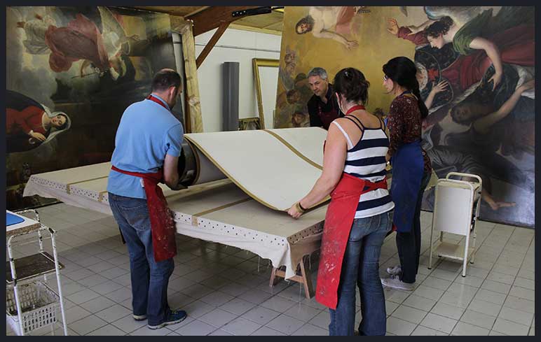 Nous réservons ce traitement aux toiles du XVIIème au XIXème siècle, déchirées ou très fragiles, et conservées dans un environnement humide (églises). La technique consiste à fabriquer une colle à base de produits naturels (cire d’abeille, résine Damar, résine Elémi) et de l’utiliser pour coller le tableau sur une toile naturelle (lin).