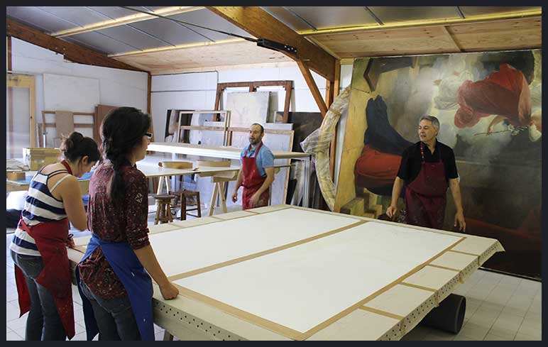 Rentoilage traditionnel à la colle de pâte : Pratiquée depuis plus de deux siècles en France et dans le sud de l’Europe, cette technique a fait ses preuves mais ne doit pas être pratiquée sans tenir compte de l’époque de l’œuvre, de ses matériaux constitutifs et de son lieu de conservation.