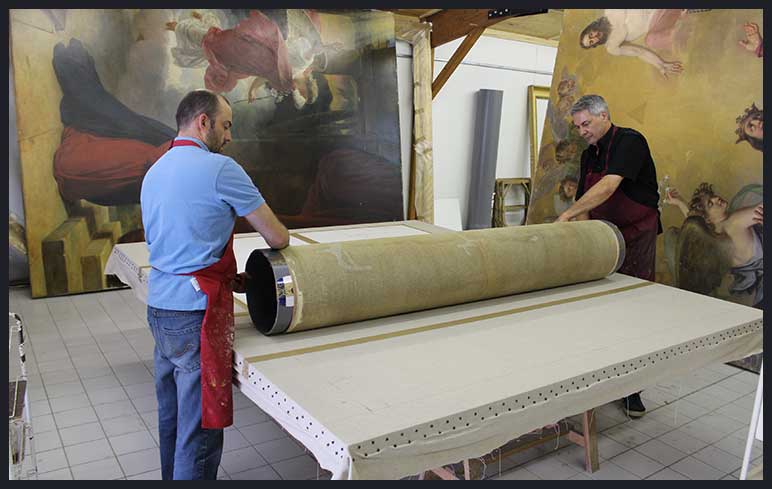 Rentoilage traditionnel à la cire/résine : Pratiquée depuis plus d’un siècle en France et dans le Nord de l’Europe, cette technique a fait ses preuves mais ne doit pas être pratiquée sans tenir compte de l’époque de l’œuvre, de ses matériaux constitutifs et de son lieu de conservation.